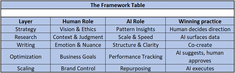 Humans pay more attention on writing style, creativity, and sounding smart and unique, whereas AI lets us focus on clicks, retention, conversions, and ranking stability.